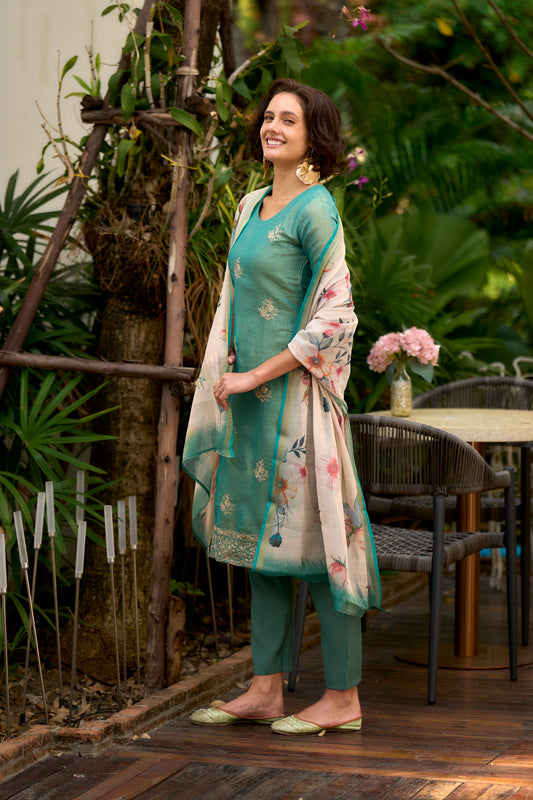 Mehendi Green Vatican Kurta Set with Embroidered Neckline & Organza Butti Dupatta
