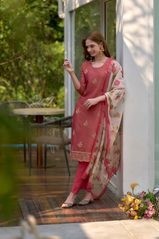 Pink Tissue Kurta Set with Embroidered Neckline & Coordinated Dupatta